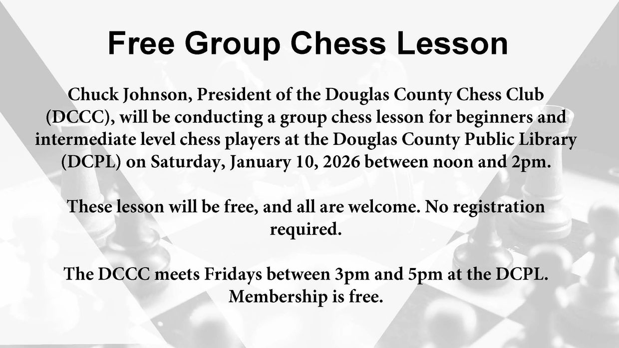Douglas County Chess Club was founded in 2024 by a group of chess enthusiasts interested in advancing creative thinking through chess. The overarching goal is to create a safe and fun environment, where all ages of chess players can experience camaraderie and the intellectually stimulating benefits of chess.